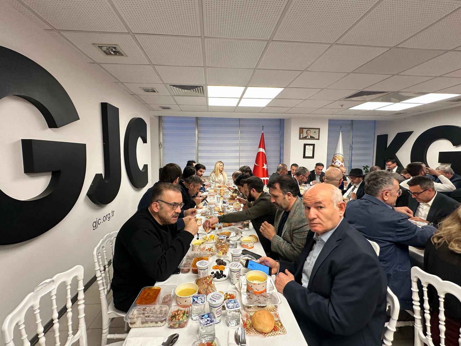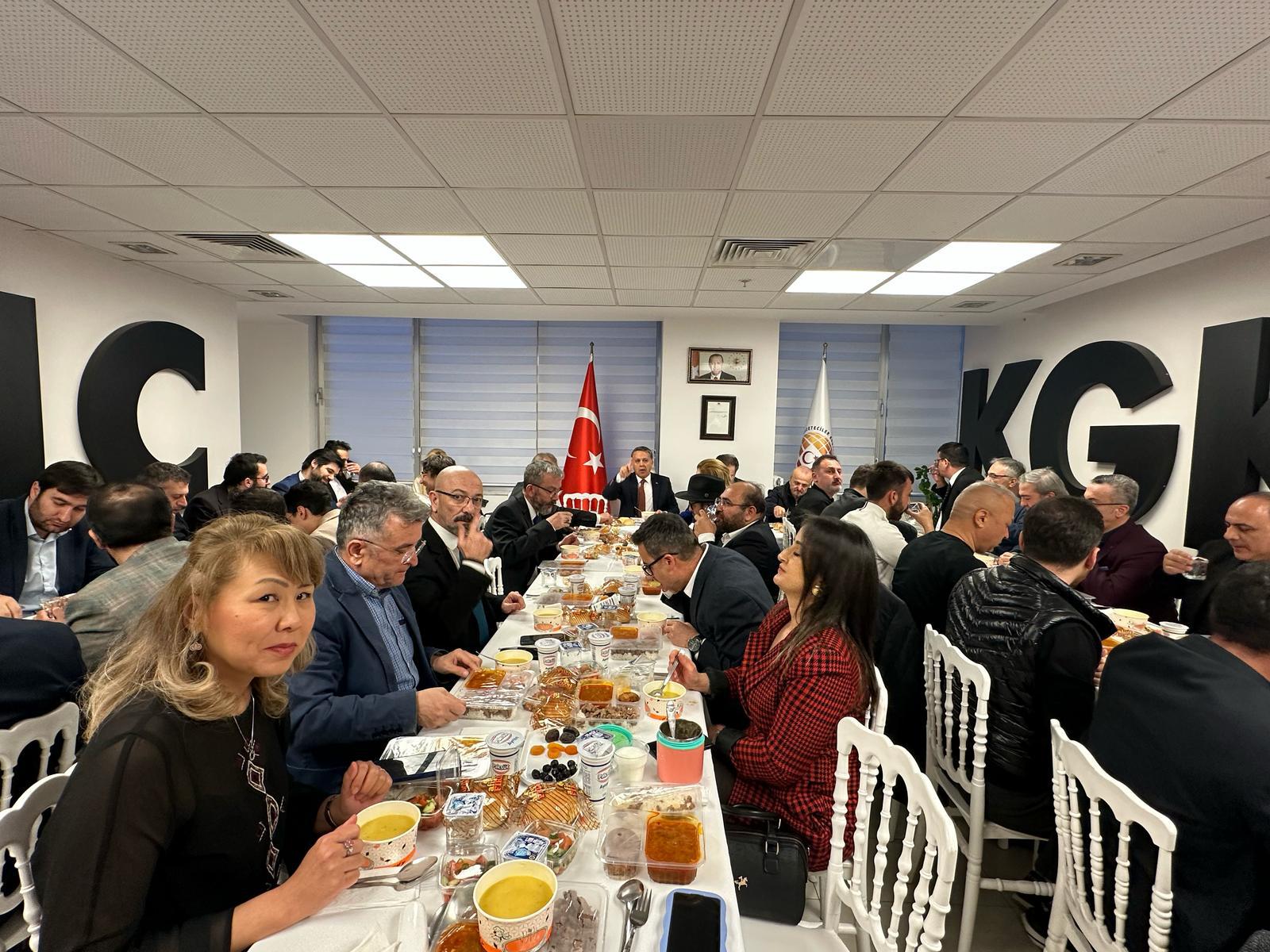 Küresel Gazeteciler Konseyi (KGK), gelenekselleşen iftar programının ilki bu yıl da Ankara’da KGK genel merkezinde gerçekleştirildi. Genel Başkan Mehmet Ali Dim’in yanısıra Genel Başkan Yardımcısı Yakup Aslan, Yönetim Kurulu üyesi Seda Demir ile Yaygın Medya Meclis Başkan Vekili Ünsal Karabulut’un konukları karşıladığı iftarda, Ankara’da görev yapan KGK üyesi gazetecilerin büyük bir çoğunluğu bir araya geldi. Balgat’taki genel merkez binasının fuaye salonunda kurulan iftar sofrası, konseyin birlik, beraberlik ve dayanışma ruhunu yansıttı. KGK Başdanışmanı Prof. Dr. Zakir Avşar, Türkiye Gazeteciler Federasyonu Genel Başkanı Yılmaz Karaca, Şiddetle Mücadele Vakfı Başkanı Adem Solak ile birçok gazeteci, iftar sofrasında buluşarak Ramazan ayının manevi atmosferini paylaştı. İftar buluşmasına katılanlar, gazeteciliğin günümüzdeki durumu, etik sorumluluklar ve sektörde yaşanan gelişmeler üzerine sohbet etti. Genel Başkan Dim, bu tür organizasyonların mesleki birlikteliği artırdığına ve Ramazan ayının ruhunu en güzel şekilde yaşattığına vurgu yaparak, katılımcılara teşekkür etti. Konuklara iftar sofrasında, iftariyelikler, çorba, çoban salata, kavurma, pilav, taze fasulye yemeği ve tatlı ikram edildi. İftar buluşması çay ikramıyla sona erdi.