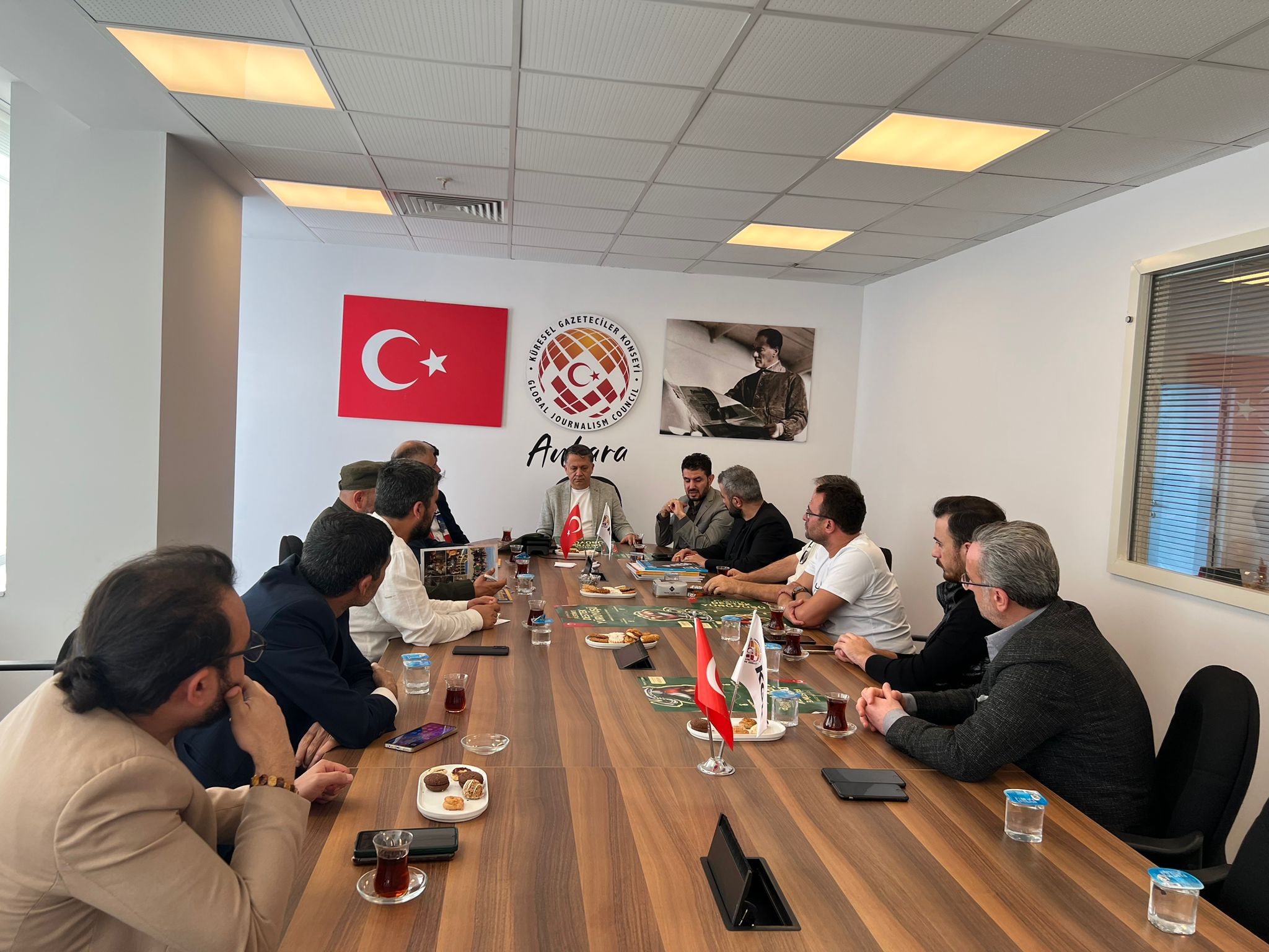 Ankara’daki sivil toplum örgütlerinin meydana getirdiği Ankara Filistin Dayanışma Platformu (ANFİDAP), Küresel Gazeteciler Konseyi Genel Merkezini ziyaret etti. ANFİDAP yöneticisi İsmail Mansur Özdemir, ANFİDAP dönem sözcüsü Aziz Oğuzhan Karaman ve Milat Gazetesi Yazarı Gazeteci Tayyar Tercan ve Filistin Gazeteciler Birliği Başkan yardımcısı Dr. Zahir Elbek’ten oluşan ANFİDAP heyetini KGK Genel Başkanı Mehmet Ali Dim, Genel Başkan Yardımcısı Yakup Aslan, KGK Yaygın Medya Meclisi Başkan Vekili Ünsal Karabulut, Meclis Başkan Yardımcısı Bekir Nazım Ada ve Ankara’daki KGK üyeleri karşıladı.