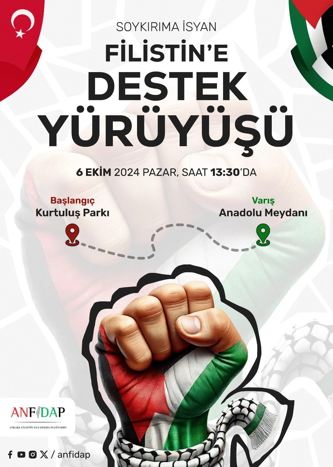 Filistin davasının Türkiye’nin davası olduğunun altını çizen ANFİDAP yöneticileri, “Filistin’de bir soykırım yaşanıyor. İsrail’in bu soykırım ve genişlemesi Türkiye’ye tehdittir.” dediler. Filistinli Gazeteciler Birliği Başkan Yardımcısı Zahir Elbek, 6 Ekim’de Ankara’da gerçekleşecek yürüyüşün önemine dikkat çekti, Elbek, yaşanan soykırımın kanıksandığı bir dönemi yaşandığı dönemde Türk halkının ilk günkü tepki ve hassasiyetinin meydanları dolduracak milyonlarla dünyaya ilan edileceğini beklediklerini söyledi.