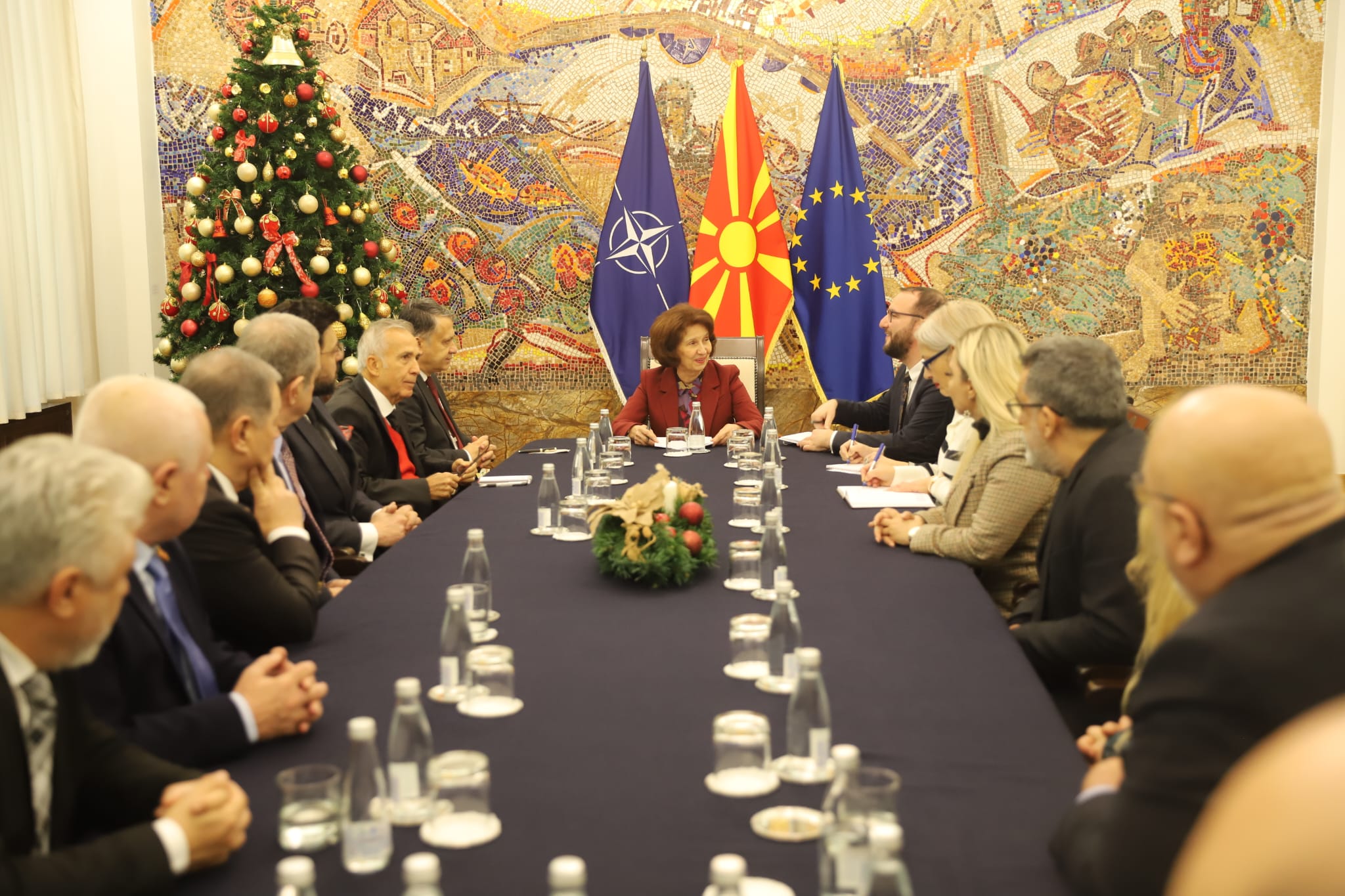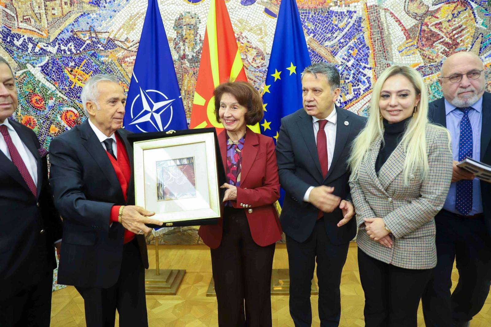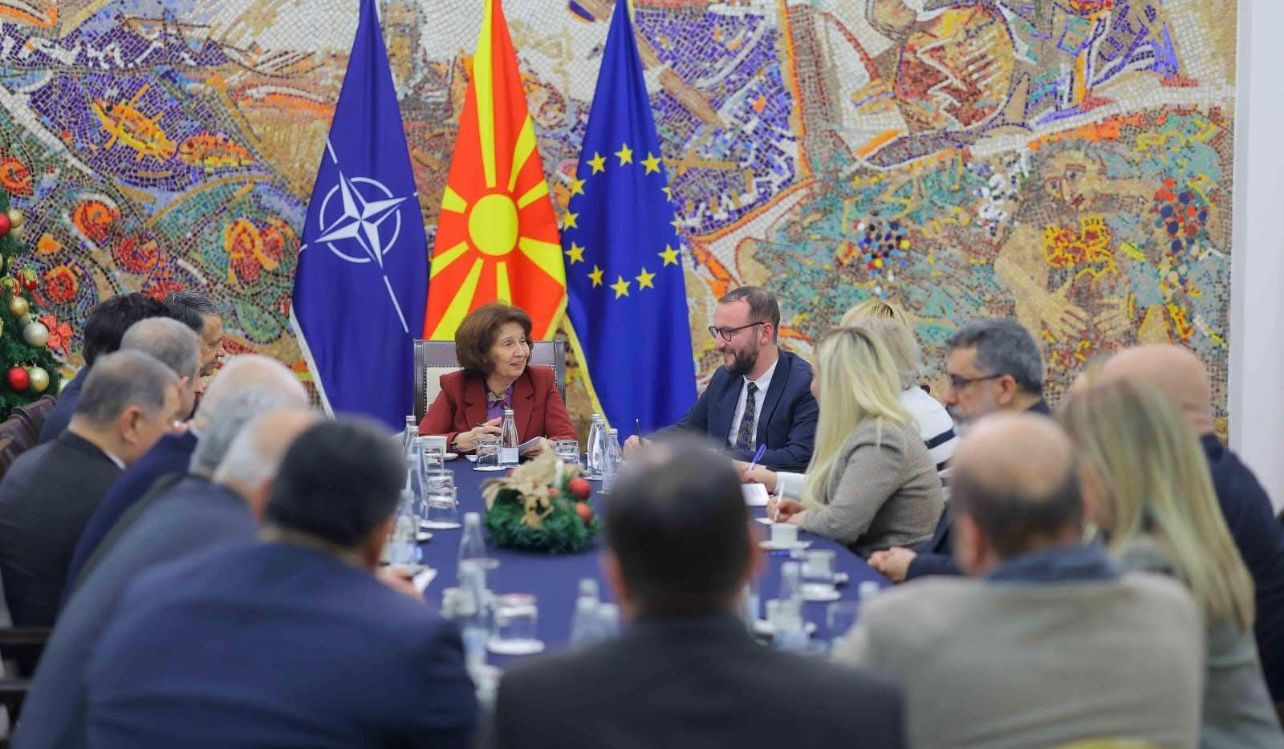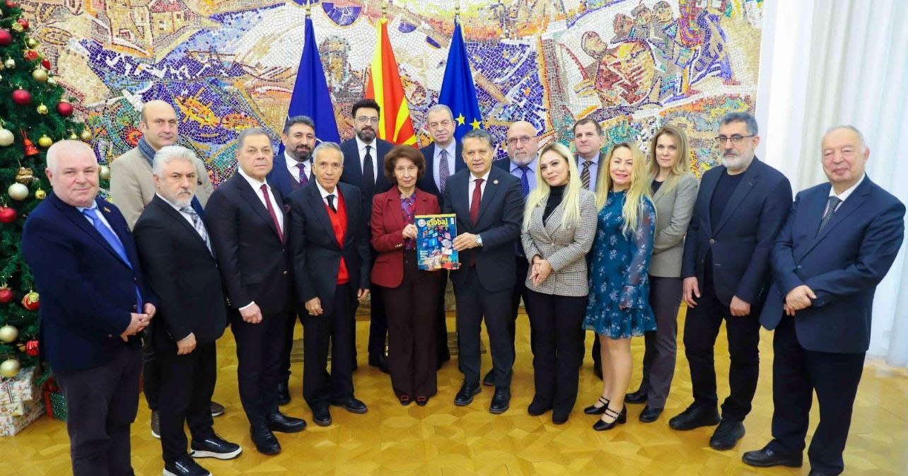 Kuzey Makedonya’nın başkenti Üsküp’te Küresel Gazeteciler Konseyi (KGK) heyeti olarak Kuzey Makedonya Cumhurbaşkanı Gordana Silyanovska-Davkova’yı ziyaret ettik. Kendisi gerçek bir Türk dostu olduğunu belirterek, Türkiye’nin Asya ülkeleri ile ilişkilerdeki muazzam rolünden, çok kutuplu yeni dünya düzeninde AB’nin kendi gözünden göremediklerini Türkiye’nin öngörme gücünden bahsetti. Ayrıca, COP 29 zirvesi kapsamında Azerbaycan’da bulunduğunu ve Bakü’nün kültürel yapısından büyülendiğini aktararak ülkelerimiz arasındaki ilişkileri önemsediğini iletti. Medya işbirliğinin önemine de söz ederek, KGK heyetinin ziyaretinden duyduğu memnuniyeti dile getirdi. KGK Genel Başkanı Mehmet Ali Dim de kendisine kabulünden dolayı teşekkür ederek, anı plaketi ve Küresel Medya dergisi takdim etti.