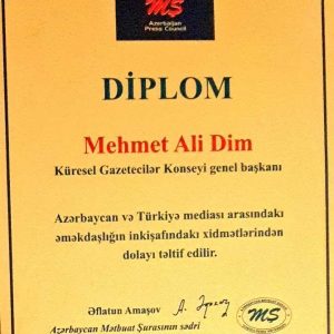 KÜRESEL Gazeteciler Konseyi (KGK) Genel Başkanı Mehmet Ali Dim’e, kardeş Azerbaycan’ın haklı tezlerinin anlatılması için ikinci kez 15 yabancı gazeteciyle gittiği Bakü’de ikinci şükran plaketi verildi.