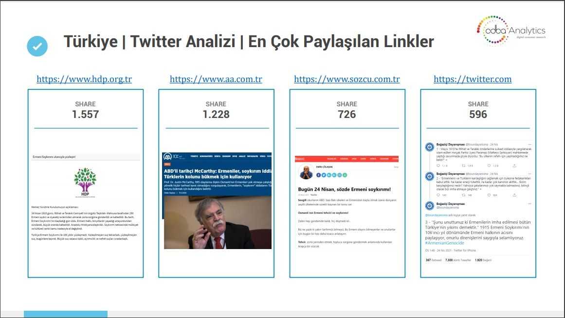 Konu ile ilgili bazı ünlü isimlerin yaptığı paylaşımlar sonucunda tepki aldığı ve bu tepkiden sonra mesajlarını silmelerinin de dikkat çektiğini aktarılan analizde, “Türkiye’de sözde soykırımı destekler nitelikte paylaşım yapan profiller ziyaret edildiğinde; PKK, HDP, PYD gibi örgüt ve parti mensubu oldukları görülmektedir” denildi.
